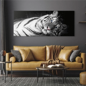 Obraz na skle - Biely tiger s modrými očami v čiernobielom prostredí - 70x50cm - Divočina a pokoj - Moderná nástenná dekorácia do obývacej izby a spálne ARTTOR