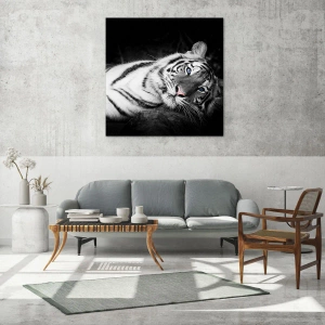 Detaily tigrej srsti sú presne reprodukované, čím zdôrazňujú jej divokosť a krásu. Kontrast medzi čiernou a bielou vytvára elegantný a nadčasový vizuálny efekt, ktorý priťahuje pozornosť a dodáva hĺbku. Intenzívny pohľad tigra symbolizuje moc, odhodlanie a neskrotnú silu prírody.