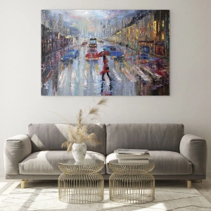 Obraz na skle - Mestská scéna v noci s dažďom a farebnými svetlami - 70x50cm - Daždivé popoludnie v meste - Moderná nástenná dekorácia do obývacej izby a spálne ARTTOR