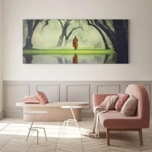 - Sklenený obraz s rozmermi 70 x 50 cm zobrazuje mnícha v oranžovom rúchu, ako sa prechádza medzi stromami pri vode a vytvára tak mystickú a harmonickú atmosféru.