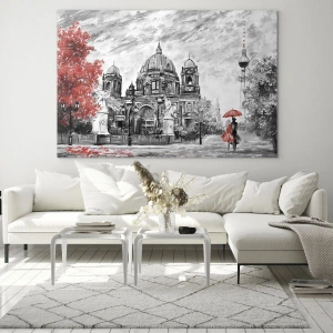 - Sklenený obraz s rozmermi 70x50 cm zobrazuje Berlínsku katedrálu s výrazným červeným akcentom v podobe stromu a dáždnika na monochromatickom pozadí.