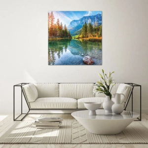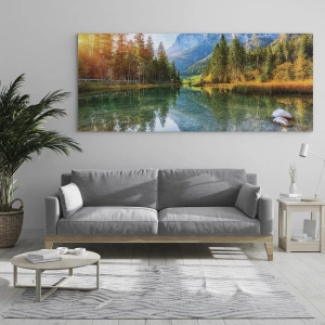 Obraz na skle - Horské jazero obklopené lesom a majestátnymi štítmi - 70x50cm - Nežnosť jesene - Moderná nástenná dekorácia do obývacej izby a spálne ARTTOR