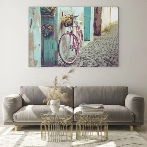 Bicykel s kvetmi v pastelovom štýle sa stáva ústredným bodom tohto obrazu. Obraz je vytvorený na skle, ktoré do interiéru vnáša sviežu jarnú atmosféru.