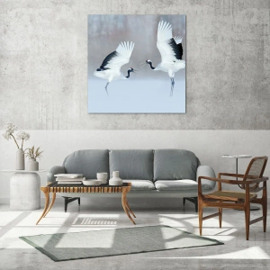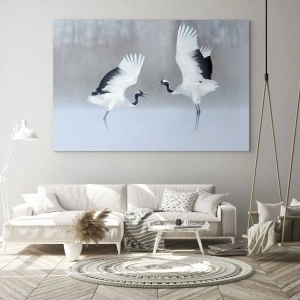 - Dva žeriavy v zimnej krajine dvíhajú krídla v harmonickom tanci. Biely sneh a ľahká hmla zdôrazňujú eleganciu a mystickú povahu tejto scény. Jemný pohyb vtákov zachytáva krásu prírody, vďaka čomu je tento obraz ideálnou dekoráciou do moderných interiérov.