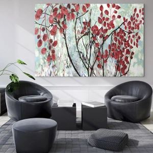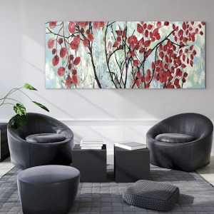 Motív konárov a listov odráža krásu prírody a meniace sa ročné obdobia. Červené listy kontrastujúce s jasným pozadím priťahujú pohľad, dodávajú obrazu hĺbku a výrazný vzhľad. Je to perfektná dekorácia pre tých, ktorí si cenia estetiku inšpirovanú prírodou.