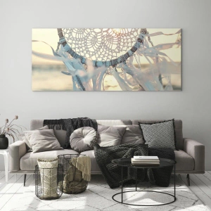 Obraz na skle - Čipkovaný totem s jemnými strapcami na pozadí zapadajúceho slnka nad morom. - 70x50cm - Čipkový totem - Moderná nástenná dekorácia do obývacej izby a spálne ARTTOR