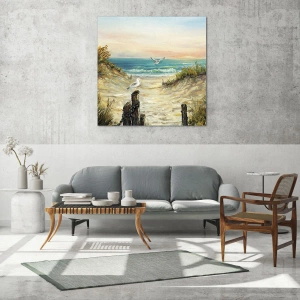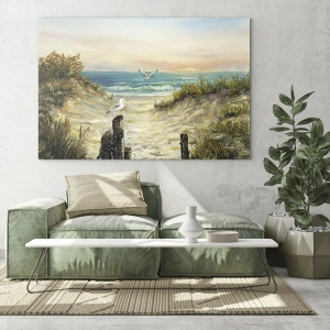 Obraz „Bezvetrie útočisko“ zachytáva krásu prírody, kde je každý detail starostlivo vykreslený, od krištáľovo čistej vody až po jemné slnečné svetlo odrážajúce sa na hladine mora. Čajka na kmeni stromu symbolizuje spojenie medzi zvieratami a týmto prírodným prostredím, kde vládne harmónia. Zlatý piesok pláže a bujná tráva vytvárajú pokojný obraz, ktorý sa dokonale hodí na vytvorenie atmosféry relaxácie a odpočinku.