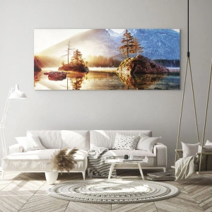 Hory, východ slnka osvetľujúci vrcholky a voda v jazere vytvárajú harmóniu na obraze „Príroda v novom svetle“. Stromy a ich odraz vo vode dodávajú scéne plnú hĺbky a pokoja. Teplé svetlo v kombinácii s prírodnými prvkami vytvára obraz, ktorý do interiéru vnáša pocit pokoja.