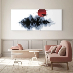Kompozícia v štýle akvarelu a s obmedzenou farebnou paletou – čierna, modrá a červená – vytvára harmonický celok a vnáša do interiéru atmosféru pokoja a meditatívnej nálady. Mierne rozmazané kontúry a prítomnosť lietajúcich vtákov umocňujú pocit priestoru a slobody. Tento obraz bude perfektnou voľbou pre moderné interiéry s ázijskými akcentmi.