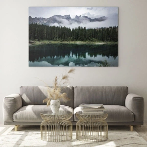- Náladová horská krajina s výhľadom na pokojné jazero obklopené hustým lesom a hmlou zahalenými vrcholmi. Odraz stromov vo vode vytvára zrkadlový efekt pokoja. Dokonalá dekorácia do interiérov inšpirovaných prírodou.