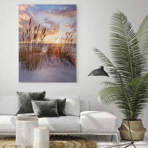 Teplé farby západu slnka sa spájajú s chladnejšími odtieňmi modrej a sivej a vytvárajú vyváženú, harmonickú kompozíciu. Slnečné svetlo preniká cez trávu a vrhá dlhé tiene na biely piesok, čím zdôrazňuje hĺbku obrazu a umožňuje divákovi takmer cítiť vietor na tvári a počuť zvuk vĺn.