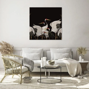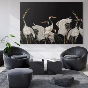 Tento motív silne odkazuje na estetiku Ďalekého východu, kde sú žeriavy symbolom dlhovekosti, šťastia a dôstojnosti. Ich umiestnenie na tmavom pozadí ďalej zdôrazňuje kontrast medzi svetlom a tieňom, čím prináša prvok dramatickosti a umeleckej hĺbky. Obraz je ideálny do klasických aj moderných priestorov, kde sa hľadá silný, no zároveň rafinovaný akcent.