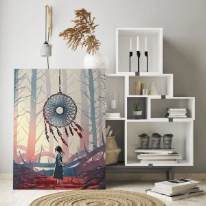 Tento mimoriadny obraz kombinuje prvky prírody s rituálnou symbolikou. Lapač snov zavesený vo vzduchu možno interpretovať ako ochranu pred zlom, sprievodcu vnútornou cestou alebo ako znak magického spojenia s duchovným svetom. Červená farba listov kontrastuje s chladnými tónmi lesa a prináša napätie a drámu.