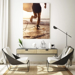 - Tento dynamický obraz zobrazuje surfera bežiaceho s doskou smerom k vlnám pri západe slnka. Je to perfektná dekorácia pre milovníkov vodných športov a tých, ktorí si užívajú dovolenkovú atmosféru.