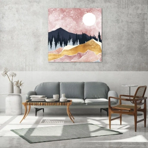 - Umelecká interpretácia nočnej krajiny s horami, lesom a splnom na pozadí ružovej oblohy. Táto sklenená obraz krajiny s rozmermi 70x50 cm kombinuje prírodu s moderným štýlom. Ideálna do interiérov s charakterom.