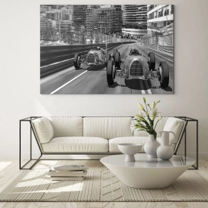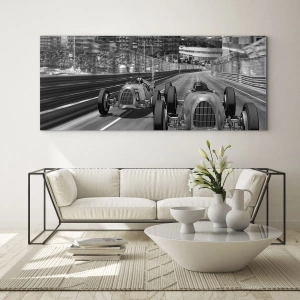 • Obraz zobrazuje scénu z historických pouličných pretekov v Monte Carle. Čiernobiela farebná schéma zdôrazňuje retro atmosféru, zatiaľ čo dynamický záber zachytáva rýchlosť a napätie súťaže. Perfektná voľba pre motoristických nadšencov.