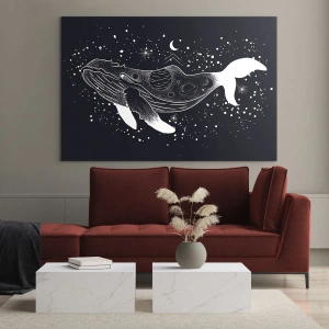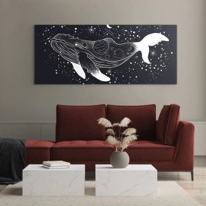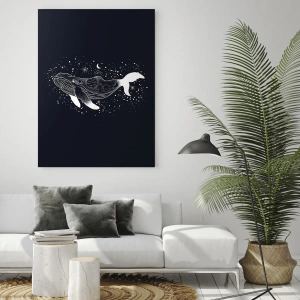 „V oceáne vesmíru“ je mimoriadny obraz, ktorý kombinuje prvky prírody a kozmickej fantázie. Na čiernom pozadí je zobrazená biela, grafická silueta veľryby, ktorá sa vznáša ako hviezdny cestovateľ medzi hviezdami a planétami. Jej telo zahŕňa nebeské symboly – mesiac, súhvezdia a kozmický prach – čo dáva kompozícii surrealistický a hlboko symbolický charakter. Tento obraz je príbehom o slobode, nekonečne a duchovnej ceste neprebádanými dimenziami.