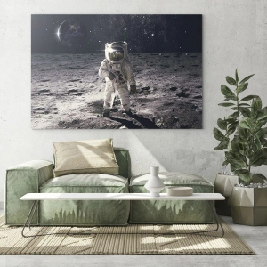Celý obraz je vyzdobený v výrazných farbách bielej, čiernej a sivej, čo mu dodáva nadčasový, moderný charakter. Krásne vykreslená textúra mesačného povrchu kontrastuje s temnou priepasťou vesmíru a vytvára jedinečnú kompozíciu. Tento motív nie je len inšpiráciou pre objavovanie, ale aj symbolom ľudského odhodlania a technologického pokroku.