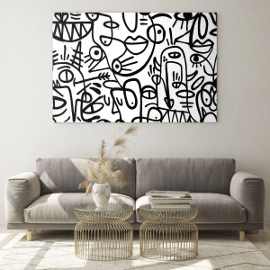 - Expresívna čiernobiela abstrakcia s motívmi tváre a očí. Dynamické usporiadanie línií vytvára moderný dizajn, ktorý priťahuje pozornosť a dodáva interiéru charakter a umeleckú energiu.