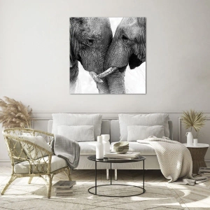 Obraz na skle - Dva slony sa dotýkajú čelami v čiernobielej farbe - 70x50cm - Úprimné vyznanie - Moderná nástenná dekorácia do obývacej izby a spálne ARTTOR
