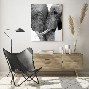 - Dojímavý čiernobiely záber dvoch slonov dotýkajúcich sa čelami. Fotografia zachytáva silu a emocionálne puto medzi zvieratami a prináša do interiéru pokoj, harmóniu a symboliku priateľstva.