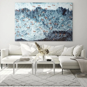 Obraz poteší aj svojou kompozíciou – dynamický pohyb vtákov je v kontraste s opakujúcim sa rytmom vĺn. To znamená, že každé pozorovanie diela odhaľuje nové detaily, ktoré pozývajú k zamysleniu a kontemplácii. Intenzita farieb – tmavo modrá voda, biela pena a žiarivá ružová peria – vytvára emocionálnu krajinu, ktorá je zároveň upokojujúca aj inšpiratívna. Je to dekorácia, ktorá dokáže premeniť atmosféru celej miestnosti.