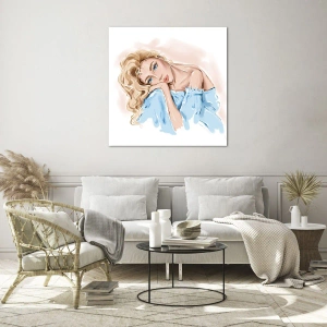 Sklenený obraz „Zasnená v modrom“ je emotívna ilustrácia ženy, ktorá sa zamyslene pozerá. Jej svetlé vlasy a modré šaty dokonale ladia s jemnými pastelovými tónmi a vytvárajú atmosféru jemnosti a pokoja.