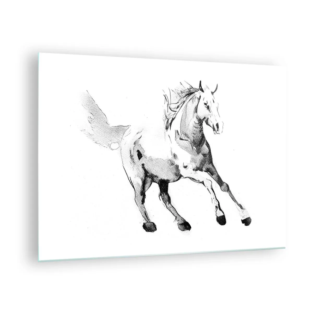 Obraz na skle - Čiernobiela skica cválajúceho koňa na bielom pozadí - 70x50cm - Neskrotená duša - Moderná nástenná dekorácia do obývacej izby a spálne ARTTOR