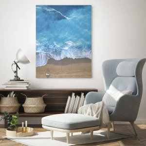 - Pohľad z vtáčej perspektívy na pokojnú pláž a intenzívne modré vlny narážajúce na breh. Kompozícia spája krásu prírody s minimalizmom. Dokonalá dekorácia pre pobrežné a moderné interiéry.