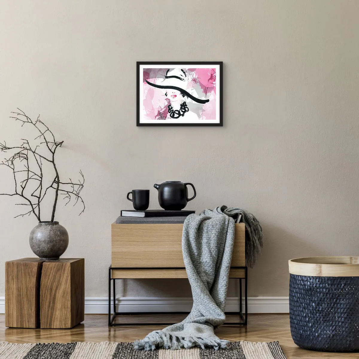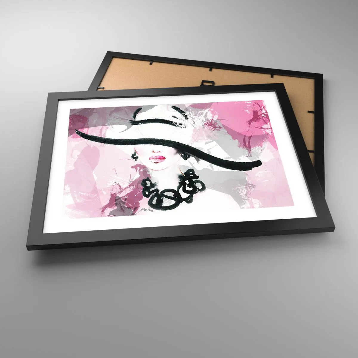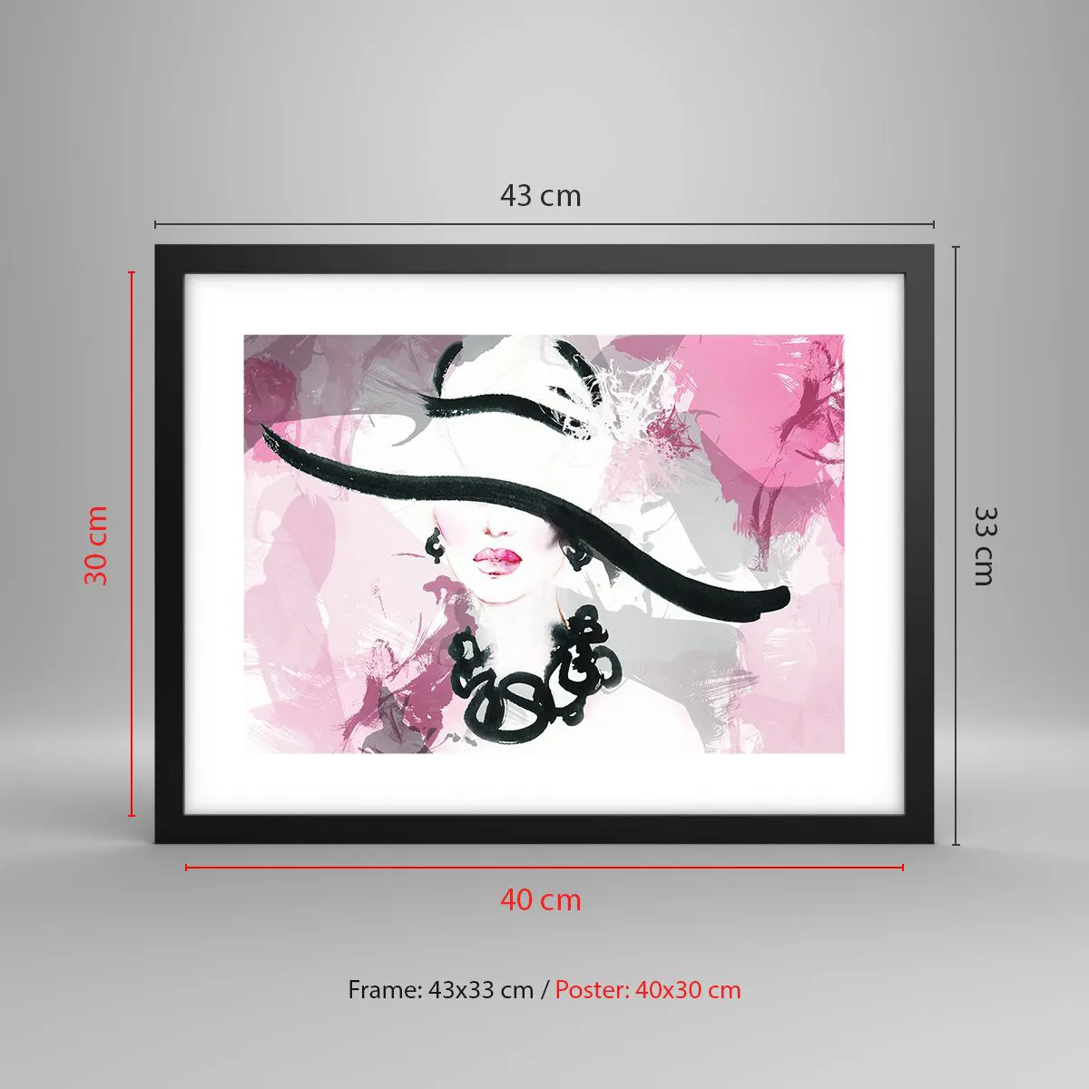 Plagát v čiernom ráme - Portrét dámy v čiernej a ružovej - 40x30 cm