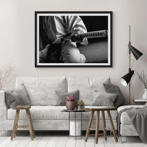 Plagát v čiernom ráme - Samuraj s mečom na čiernobielej fotografii - 50x70cm - Duša bojovníka - Moderná nástenná dekorácia do obývacej izby a spálne ARTTOR