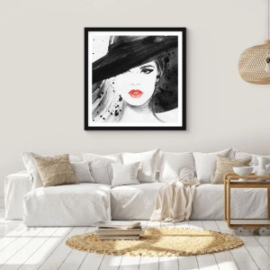 Plagát „Dáma v čiernom“ je štýlový portrét ženy v klobúku, ktorý poteší svojou eleganciou a moderným štýlom. Monochromatické farby obrazu, prerušené výrazným akcentom červených pier, vytvárajú mimoriadne expresívnu a harmonickú kompozíciu.