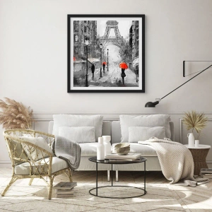 Plagát v čiernom ráme - Čiernobiela Eiffelova veža s červenými dáždnikmi v daždi - 50x70cm - Všetky cesty vedú k nej - Moderná nástenná dekorácia do obývacej izby a spálne ARTTOR
