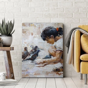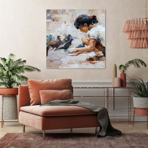 - Tento obraz zobrazuje dievča kŕmiace vtáky, vykreslené v jemnom, maliarskom štýle. Očarujúca dekorácia, ktorá vnesie harmóniu a jemnosť do každého interiéru.