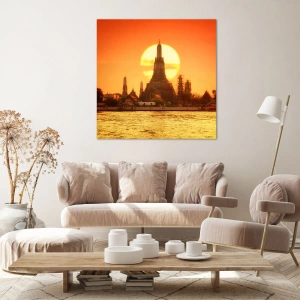 - Obraz zobrazujúci západ slnka nad chrámom s jeho odrazom vo vode. Unikátna dekorácia, ktorá do interiéru vnáša harmóniu a orientálnu atmosféru.