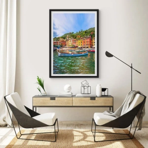 Plagát v čiernom ráme - Prístavná scéna s farebnými budovami a loďami - 50x70cm - Talianske dopoludnie - Moderná nástenná dekorácia do obývacej izby a spálne ARTTOR