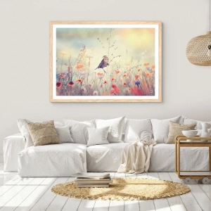Plagát v ráme zo svetlého duba - Portrét vtáka s lúkou v pozadí - 40x40 cm
