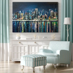 - Obraz zobrazuje nočnú mestskú krajinu s mrakodrapmi odrážajúcimi sa od pokojnej vody. Jeho žiarivé farby a moderný štýl z neho robia jedinečnú interiérovú dekoráciu.