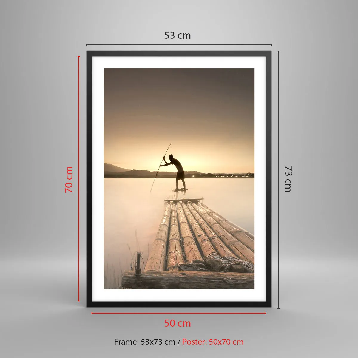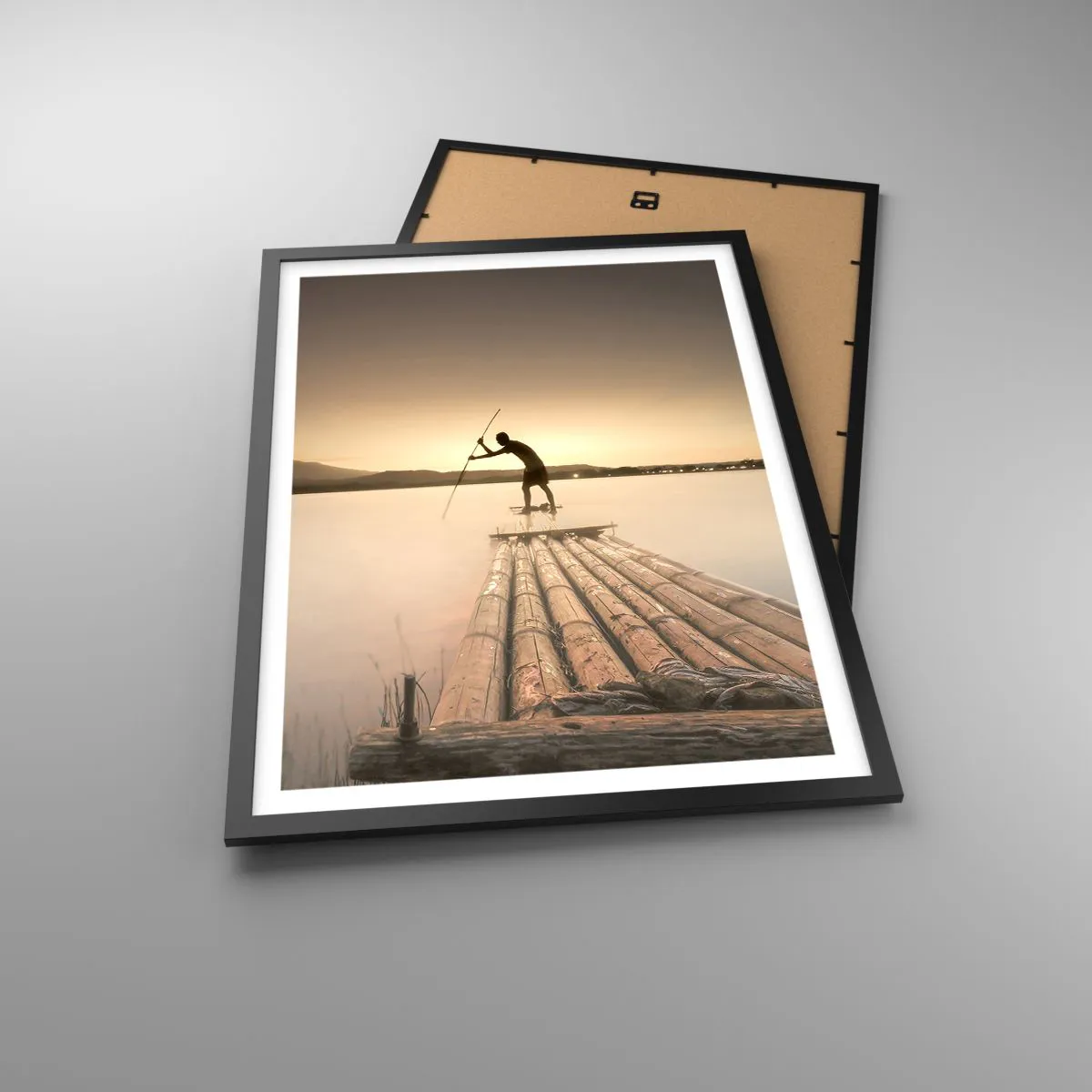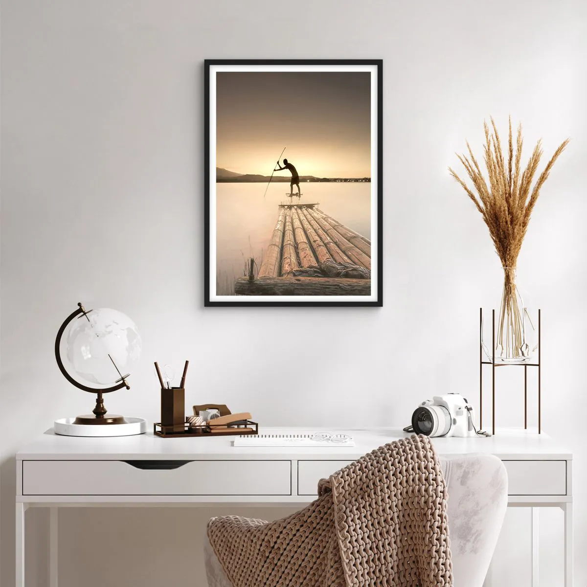 Plagát v čiernom ráme - Postava na bambusovom plti pri západe slnka - 50x70cm - Pred odpočinkom - Moderná nástenná dekorácia do obývacej izby a spálne ARTTOR