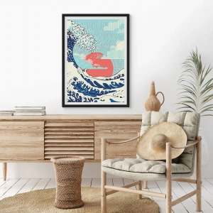- Tento plagát zobrazuje grafickú vlnu inšpirovanú Japonskom s červeným slnkom na obzore. Je to perfektná voľba do moderného interiéru. Súčasťou je čierny rám a má rozmery 50x70 cm.