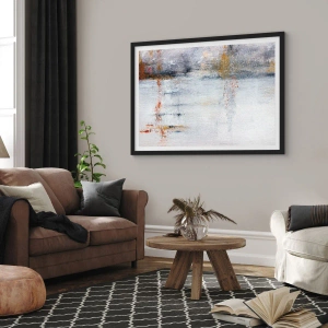 Plagát v čiernom ráme - Abstraktná kompozícia s odtieňmi sivej, bielej a zlatej. - 50x70cm - Za závojom vzduchu - Moderná nástenná dekorácia do obývacej izby a spálne ARTTOR