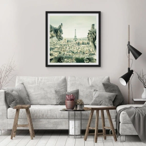 Plagát v čiernom ráme - Chrlič s výhľadom na Eiffelovu vežu a panorámu Paríža - 50x70cm - Parížske rozprávanie - Moderná nástenná dekorácia do obývacej izby a spálne ARTTOR