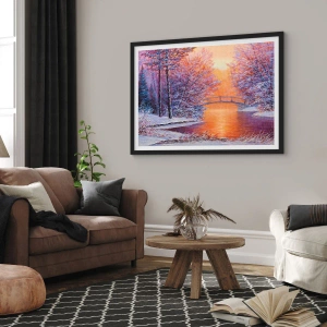 Plagát v čiernom ráme - Zimná krajina s mostom a zapadajúcim slnkom odrážajúcim sa v rieke - 50x70cm - Stretneme sa tu - Moderná nástenná dekorácia do obývacej izby a spálne ARTTOR