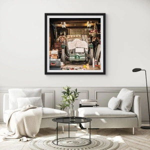 Plagát v čiernom ráme - Veterán v garáži obklopený náradím - 50x70cm - Späť do minulosti - Moderná nástenná dekorácia do obývacej izby a spálne ARTTOR