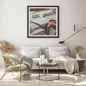 Plagát v čiernom ráme - Ruky prezerajú vinylové platne v hudobnom obchode - 50x70cm - Hľadanie emócií - Moderná nástenná dekorácia do obývacej izby a spálne ARTTOR