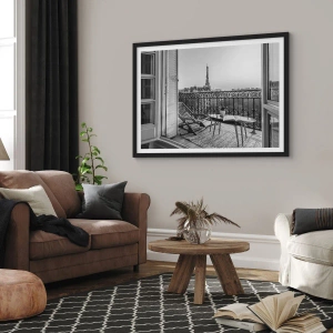 Plagát v čiernom ráme - Výhľad na Eiffelovu vežu z elegantného parížskeho balkóna - 50x70cm - Parížske popoludnie - Moderná nástenná dekorácia do obývacej izby a spálne ARTTOR