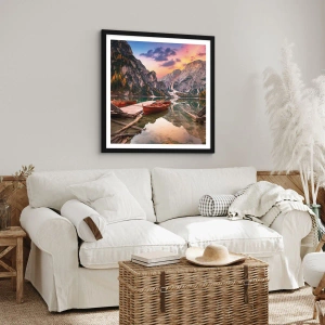 Plagát v čiernom ráme - Drevené lode na jazere obklopenom horami pri západe slnka - 50x70cm - Sľub dňa - Moderná nástenná dekorácia do obývacej izby a spálne ARTTOR