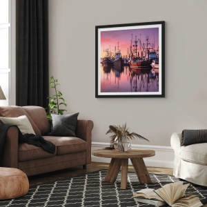 Plagát v čiernom ráme - Rybárske lode v prístave pri západe slnka - 50x70cm - Pred ďalším dňom - Moderná nástenná dekorácia do obývacej izby a spálne ARTTOR