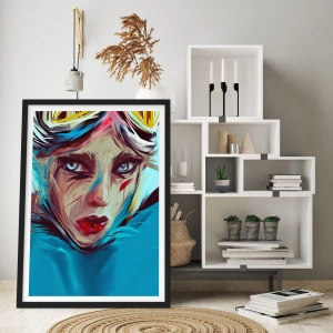 Plagát v čiernom ráme - Portrét ženy s intenzívnym pohľadom a modrým pozadím - 50x70cm - Silničná bojovníčka - Moderná nástenná dekorácia do obývacej izby a spálne ARTTOR