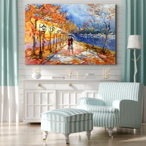 - Obraz „Spolu až do konca času“ zobrazuje pár prechádzajúci sa jesenným parkom pri rieke, chránený dáždnikom. Malebná a atmosférická kompozícia, ideálna do romantických interiérov.